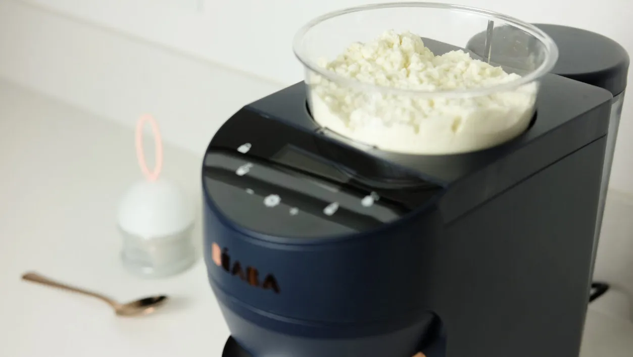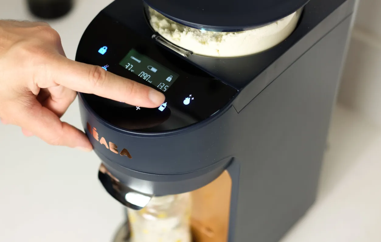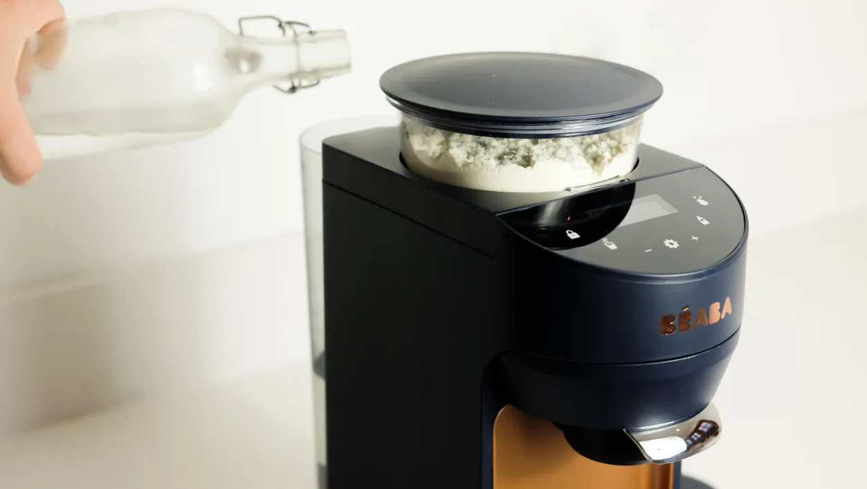 - En Un Seul Geste Milkeo Dose Et Melange L’Eau Et La Poudre Puis Distribue Directement Le Lait Dans Le Biberon