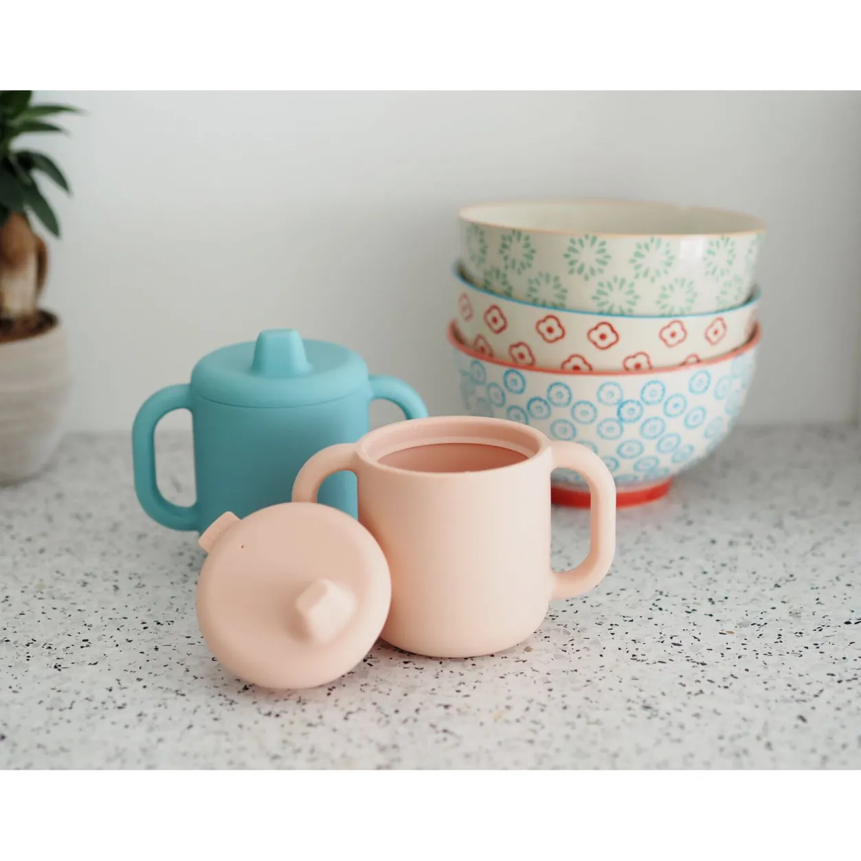 - Tasse D’Apprentissage En Silicone, Composee De 2 Anses Et D’Un Couvercle Bec Amovible
